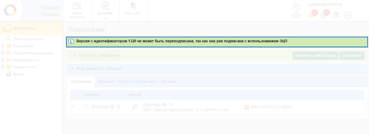 Рис. 8. Задача подписания документа. Уведомление о невозможности повторного подписания