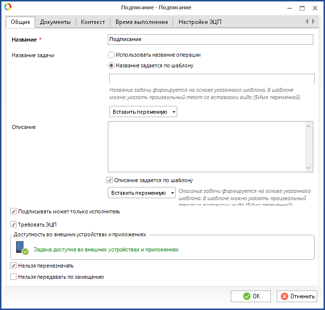 Флажок Описание задается по шаблону позволяет формировать описание задачи по шаблону. В шаблон могут входить: произвольный текст, значения контекстных переменных и параметры текущего экземпляра процесса.