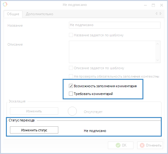 Возможность заполнения комментария – флажок, установка которого дает возможность пользователю оставить комментарий при выполнении задачи по данному переходу. При установке данного флажка будет отображено дополнительное поле Требовать комментарий.