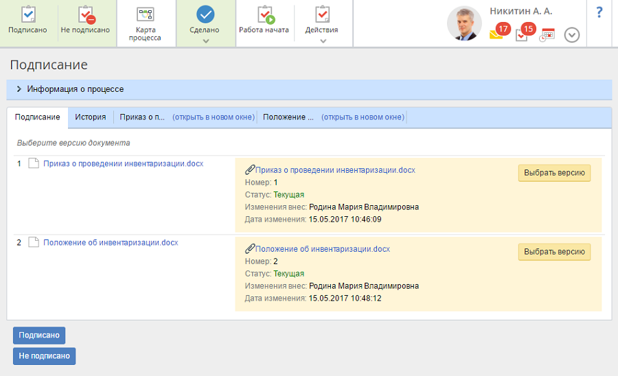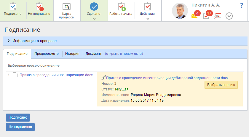 Не подписано – при нажатии на данную кнопку процесс будет направлен по исходящему переходу со статусом Не подписано. Ее необходимо нажать после того, как пользователь ознакомился с документом и принял решение не подписывать документ.