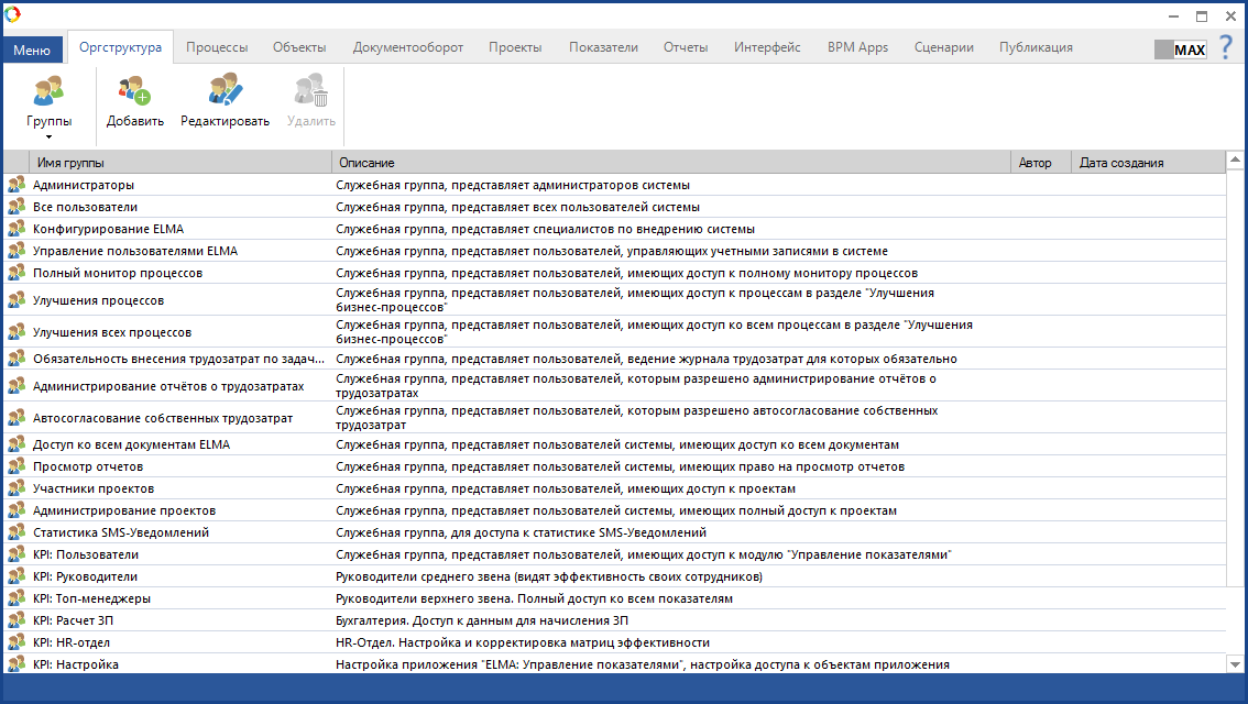 Рис. 1. Дизайнер ELMA. Вкладка "Оргструктура". Раздел "Группы пользователей"