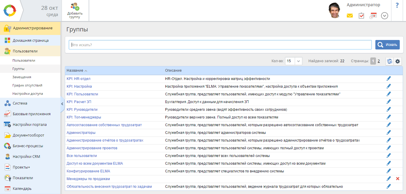 Рис. 2. Раздел "Администрирование – Пользователи – Группы"