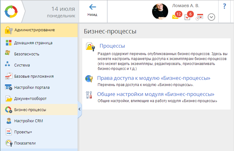 РазделАдминистрирование – Бизнес-процессы предназначен для конфигурирования приложения Управление бизнес-процессами – для настройки политики безопасности и разграничения прав доступа к процессам и на выполнение различных операций в рамках работы с бизнес-процессом.