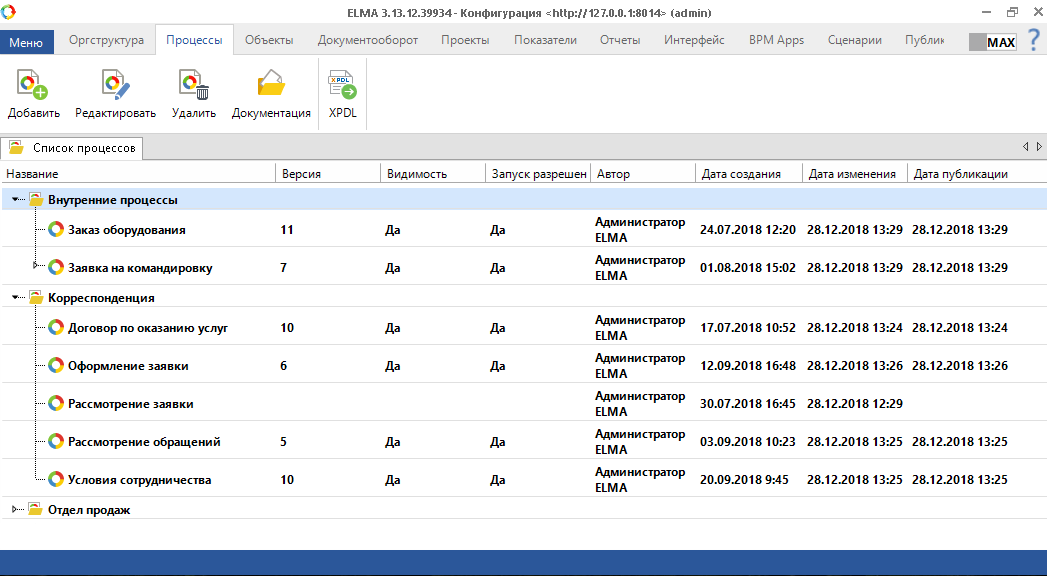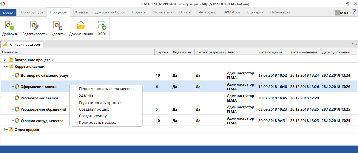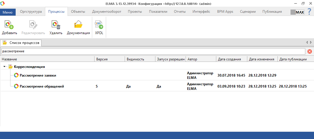 Для создания и моделирования бизнес-процессов необходимо в Дизайнере ELMA в верхнем меню выбрать вкладку Процессы. При этом в главном окне откроется список всех доступных в данный момент процессов.