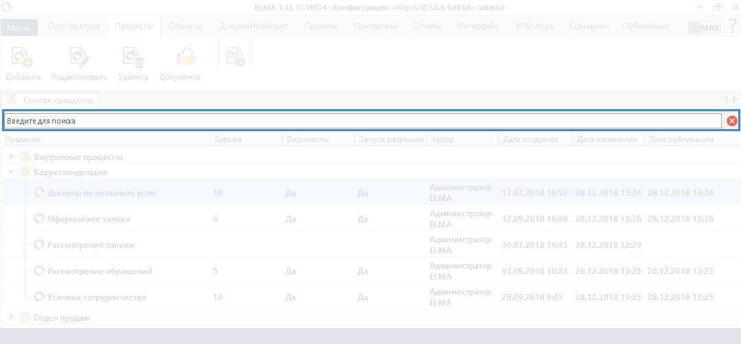 В системе ELMA существует возможность поиска по списку процессов. Для начала поиска необходимо на