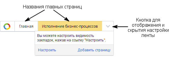 В данной ленте отображается список доступных пользователю главных страниц. Для перехода на нужную страницу, щелкните кнопкой мыши по ее названию в ленте.