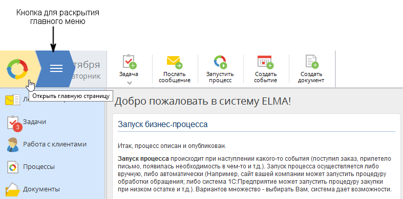 Для открытия главного меню наведите указатель мыши на логотип ELMA в левом верхнем углу главной страницы и дождитесь появления справа кнопки для раскрытия главного меню (рис. 2).