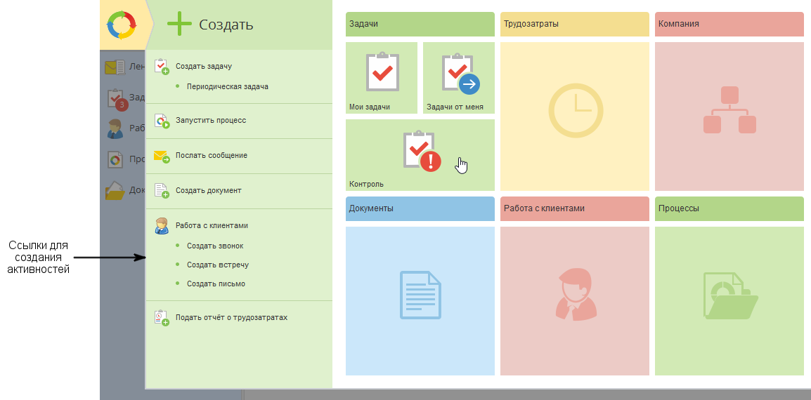 При наведении мыши на раздел системы, например, "Задачи", "Документы", "Работа с клиентами" и т.д., появляются кнопки для перехода в разные подразделы данного раздела. Например, на рис. 3 указатель наведен на раздел "Задачи". Для перехода в нужный раздел наведите на него курсор мыши и нажмите по нему.