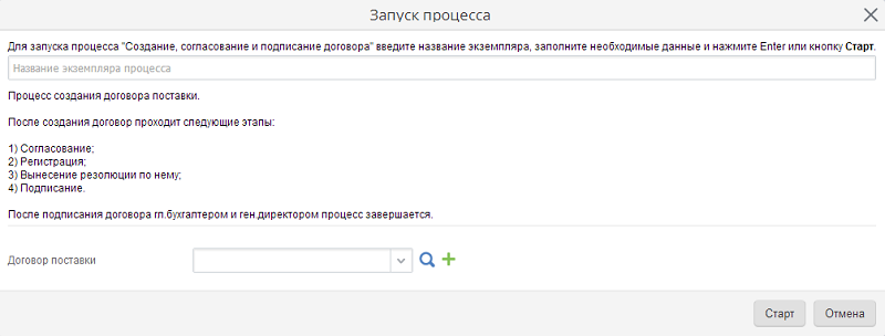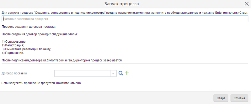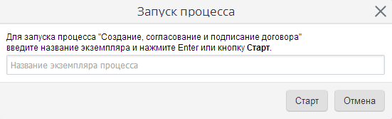 Введите название экземпляра процесса и нажмите либо кнопку Старт, либо клавишу Enter. После чего в системе будет создан новый экземпляр процесса. С этого момента он считается запущенным, и первому исполнителю по процессу поступает первая задача.