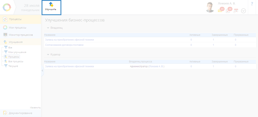 с любой страницы подраздела Улучшения бизнес-процессов в разделе Процессы.