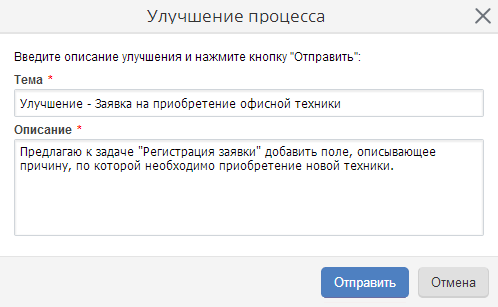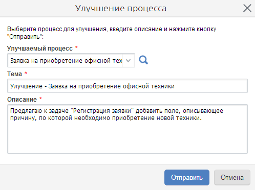 По нажатию на кнопку Улучшить (рис. 1), появится окно создания предложения по улучшению процесса (рис. 2). Из списка процессов выберите тот, который необходимо улучшить, укажите тему, опишите свое предложение и нажмите кнопку Отправить либо Отмена, если отправлять предложение не требуется.