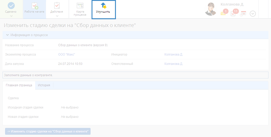 Рис. 3. Кнопка "Улучшить" в задаче по процессу для создания предложения по улучшению процесса