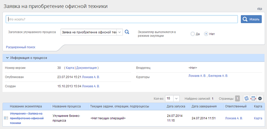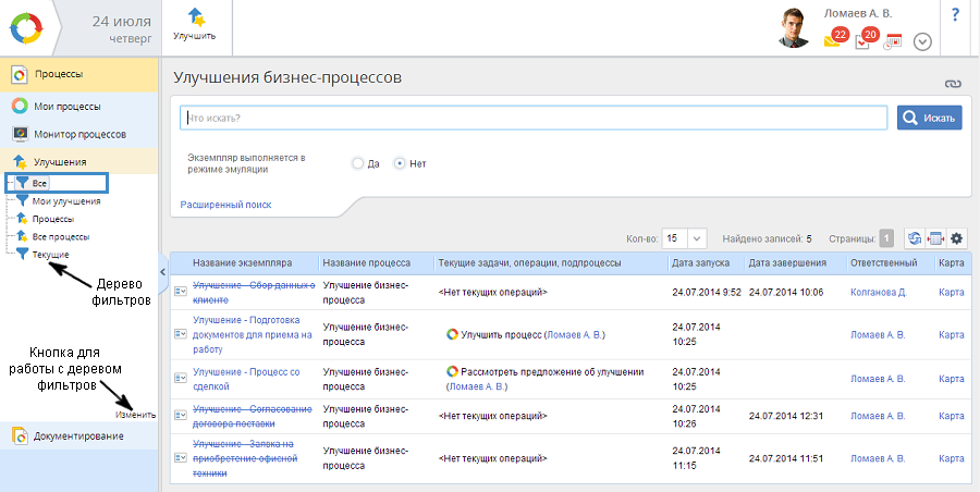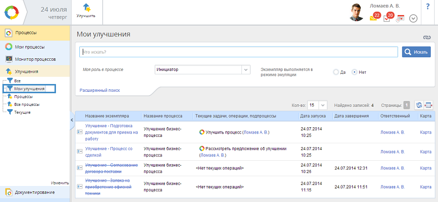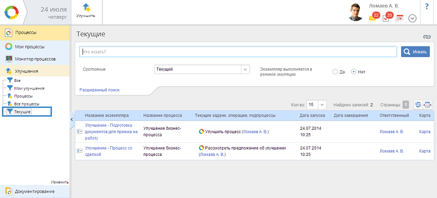 Текущие – в этом разделе отображаются все текущие экземпляры процессов по улучшению, доступные пользователю (рис. 5).