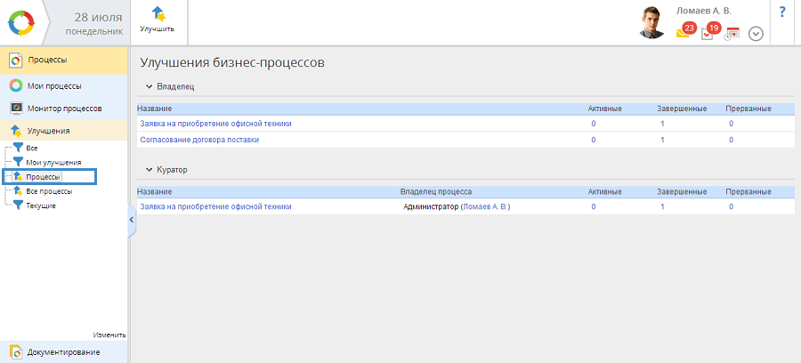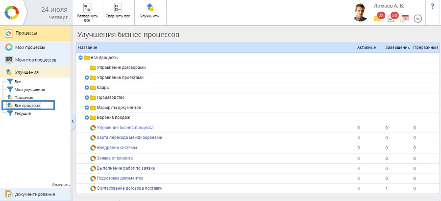 Перейдя в раздел Улучшения бизнес-процессов, пользователь автоматически попадает в подраздел Процессы (рис. 3).