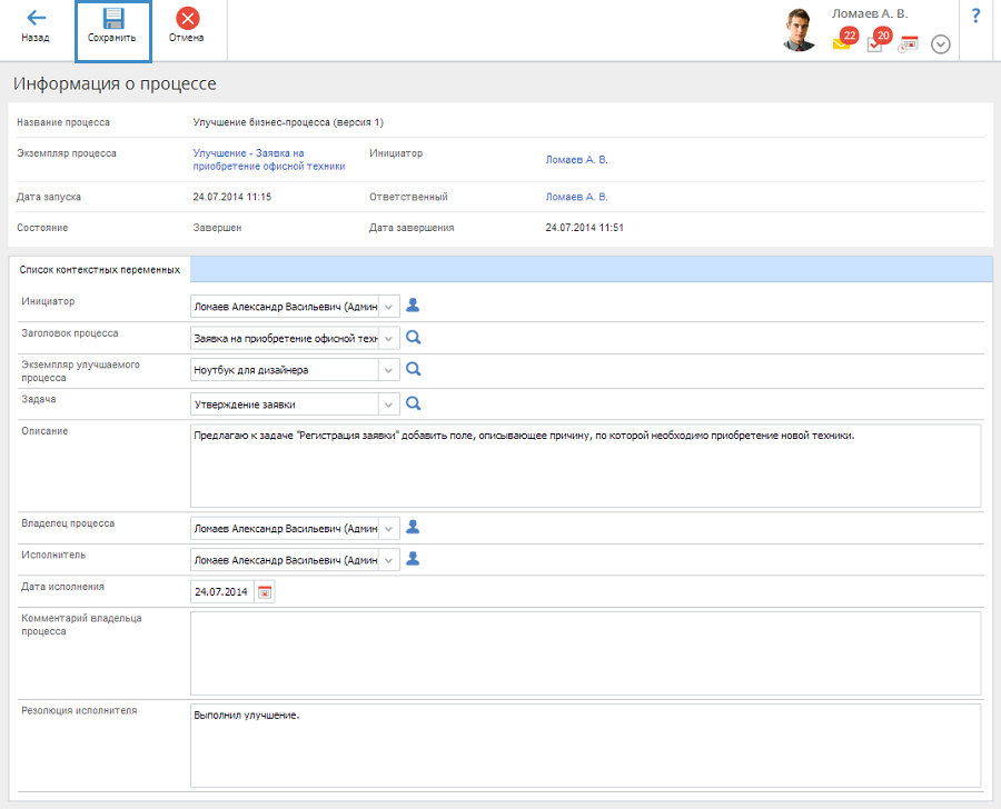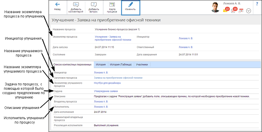 Щелкнув мышью по названию экземпляра процесса по улучшению, Вы попадете на страницу экземпляра процесса (рис. 7).