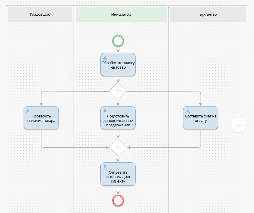 Особенность этих элементов BPMN заключается в том, что выходящие из шлюзов ветки процесса выполняются одновременно. При этом блок-схема их использования предусматривает один открывающий шлюз и один закрывающий. Процесс не пойдет дальше, пока все ветви не будут выполнены, т.е. не закончатся закрывающимся шлюзом. Если в одном из этих шлюзов используется вложенный аналогичный шлюз, он тоже должен иметь открывающий и закрывающий элемент - закрывать родительский и дочерний шлюз одним элементом нельзя. Также логика работы параллельного И-шлюза предусматривает только один входящий и один исходящий переходы.