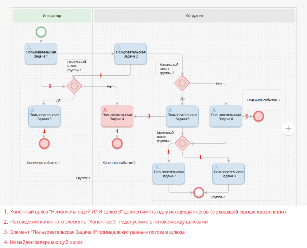 Ниже приведены примеры модели параллельного шлюза (1), неисключающего ИЛИ шлюза (2) и их совместного использования (3). Также показана схема неправильного использования шлюзов (4).