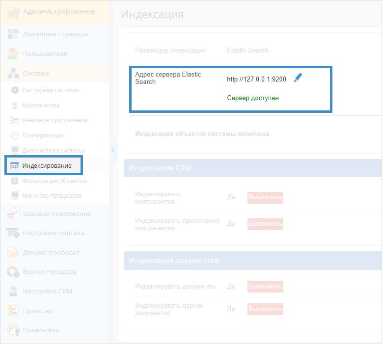 Возможность использования полнотекстового поиска с помощью провайдера индексации ElasticSearch доступна только в редакциях системы Стандарт и Корпоративная.