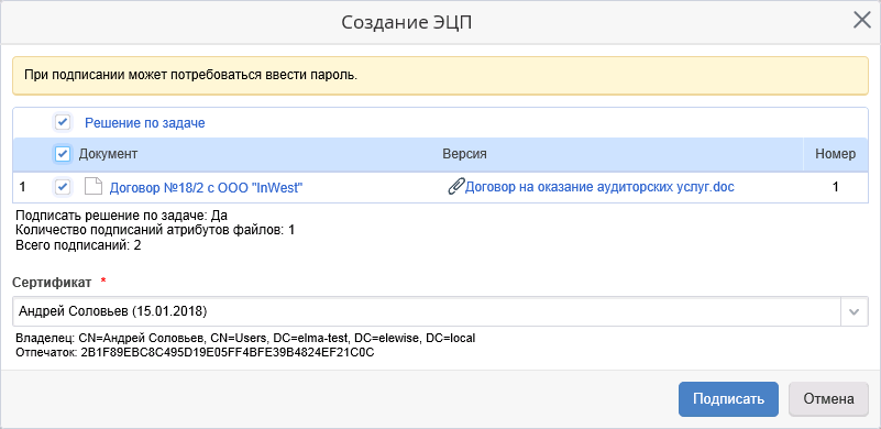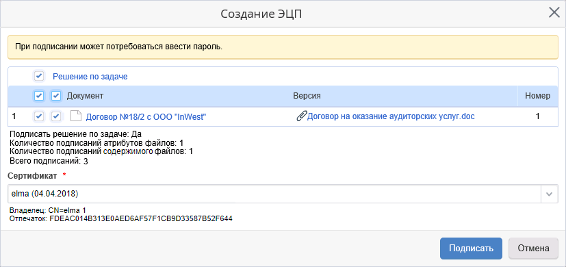 В открывшемся окне необходимо установить флажки слева от объектов (решение по задаче, атрибуты файла), требующих подписания, в поле Сертификат* выбрать требуемый сертификат для подписания и нажать на кнопку Подписать.