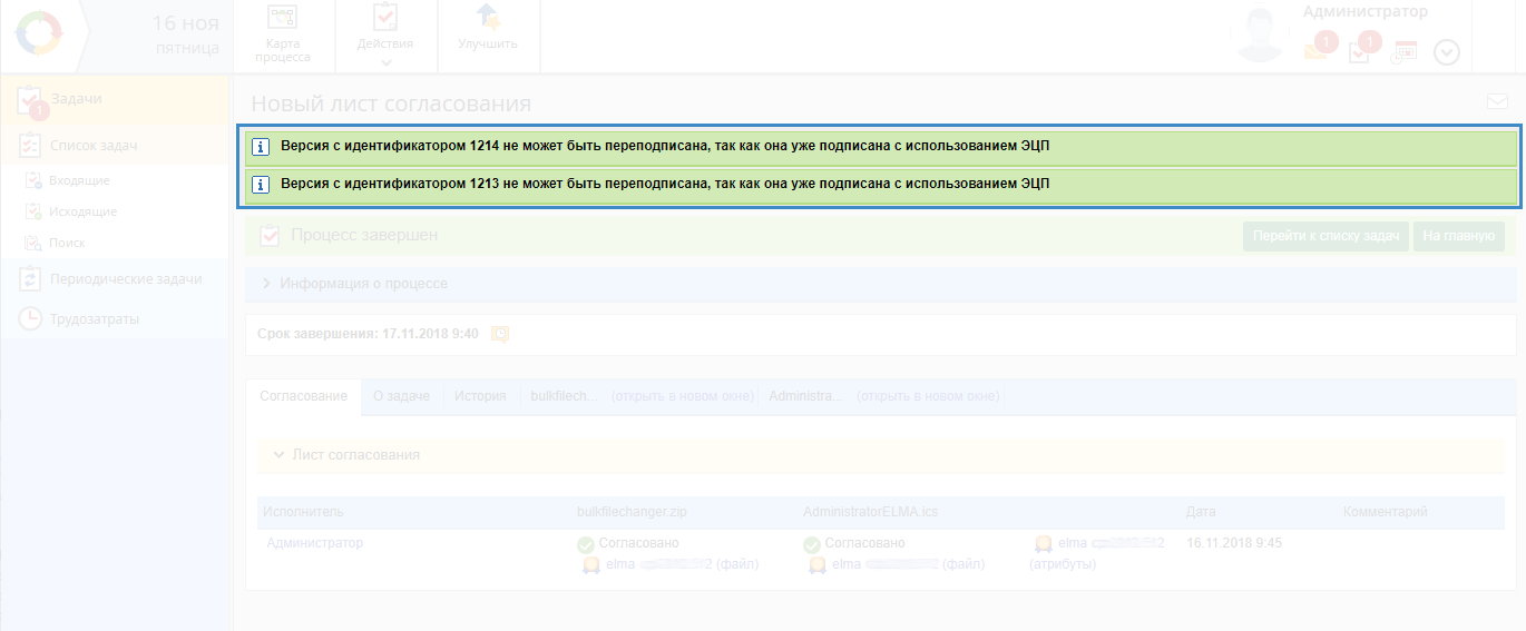Рис. 3. Задача согласования документа. Уведомление о невозможности повторного согласования