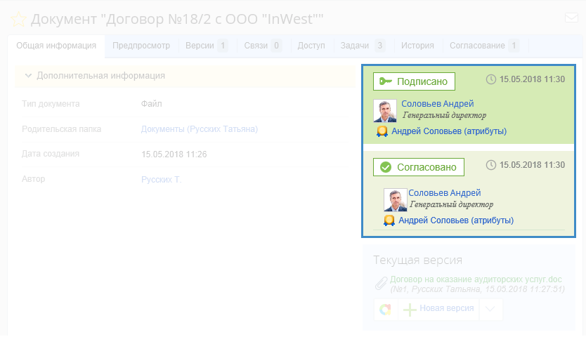 В карточке документа на вкладке Общая информация будет отображена надпись с информацией о подписании (рис. 5).