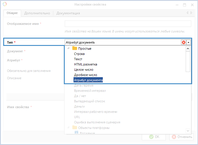 Настройки свойства типа данных "Атрибут документа"