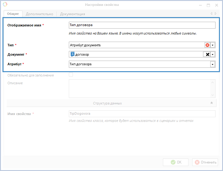 На рис. 2 выделены дополнительные поля для заполнения, отображаемые при выборе типа данных Атрибут документа на вкладке Общие.