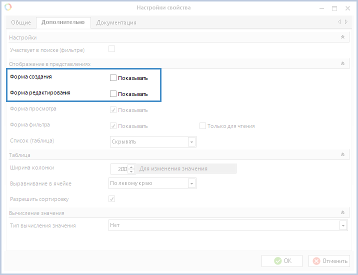 Для того, чтобы не вводить в заблуждение пользователей, рекомендуется в карточке атрибута типа РКК на вкладке Дополнительно снять флажки Показывать для форм создания и редактирования (рис. 4). Таким образом, при регистрации или редактировании РКК данный атрибут отображаться не будет, т.к. его значение формируется при регистрации посредством автоматического заполнения значения из соответствующего атрибута документа.