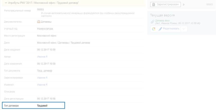 В веб-приложении, на карточке документаДоговор, в разделе Атрибуты РКК будет отображено значение атрибута документа Тип договора (рис. 5). В том случае, если данный атрибут не заполнен, будет отображено пустое значение.