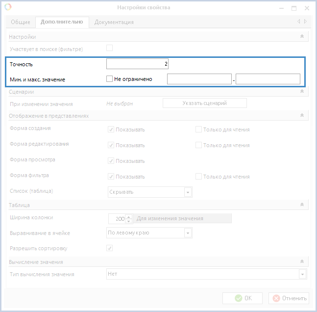 Настройки свойства типа "Дробное число" в Дизайнере