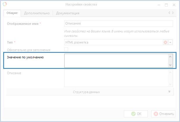 На рис. 2 выделено дополнительное поле для заполнения, отображаемое при выборе типа данных HTML-разметка на вкладке Общие.