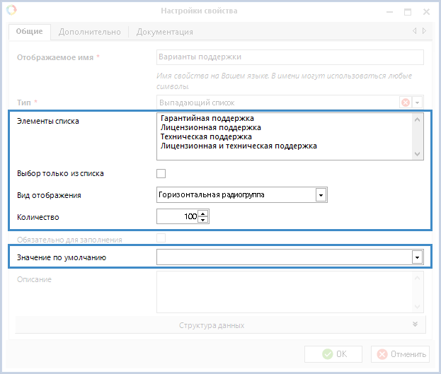 Количество – позволяет ограничить максимальное количество отображаемых в списке элементов. По умолчанию в данном поле установлено значение 100. Данное поле отображается только в том случае, если в поле Вид отображения было выбрано значение Горизонтальная радиогруппа или Вертикальная радиогруппа. Следует отметить, что, если количество элементов, указанное в данном поле, будет превышено, будет использоваться Стандартный вид отображения элементов списка.