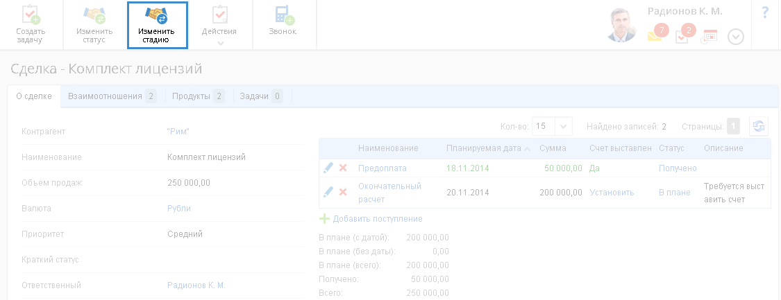 Рис. 1. Карточка сделки. Кнопка "Изменить стадию"