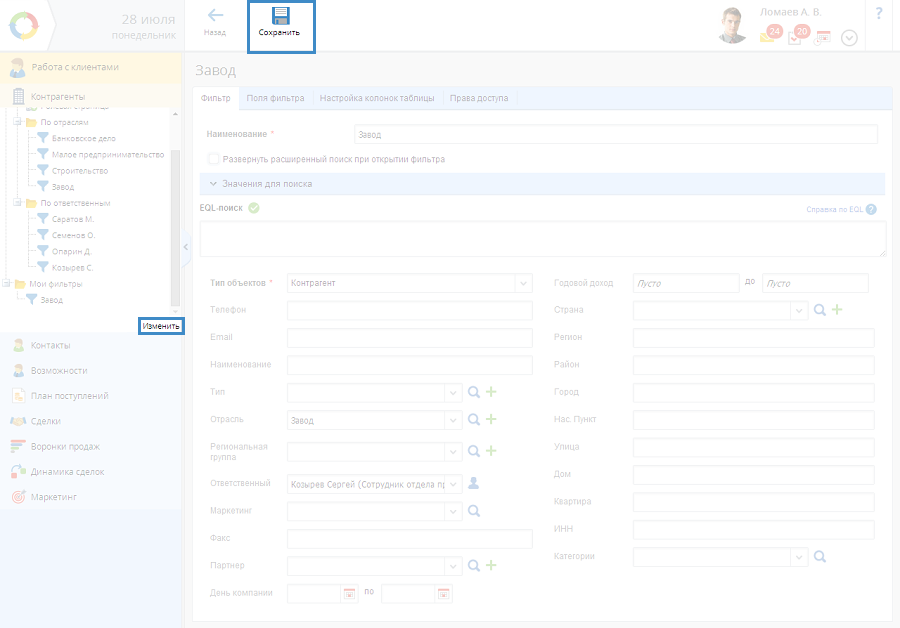 Для редактирования фильтра необходимо открыть его карточку и на вкладках с данными фильтра изменить его настройки. После изменений следует нажать на кнопку Сохранить (рис.1).