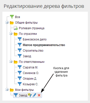 Возможностью удаление фильтров в папке "Мои фильтры" обладают авторы фильтра, а в папке "Общие фильтры" - пользователи, имеющие права доступа на редактирование дерева общих фильтров. Права назначаются в разделе Администрирование – Пользователи – Настройки доступа – Глобальные настройки доступа – Редактирование дерева общих фильтров.
