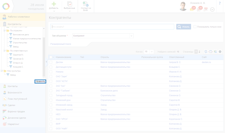 Рис. 1. Дерево фильтров в разделе "Контрагенты"