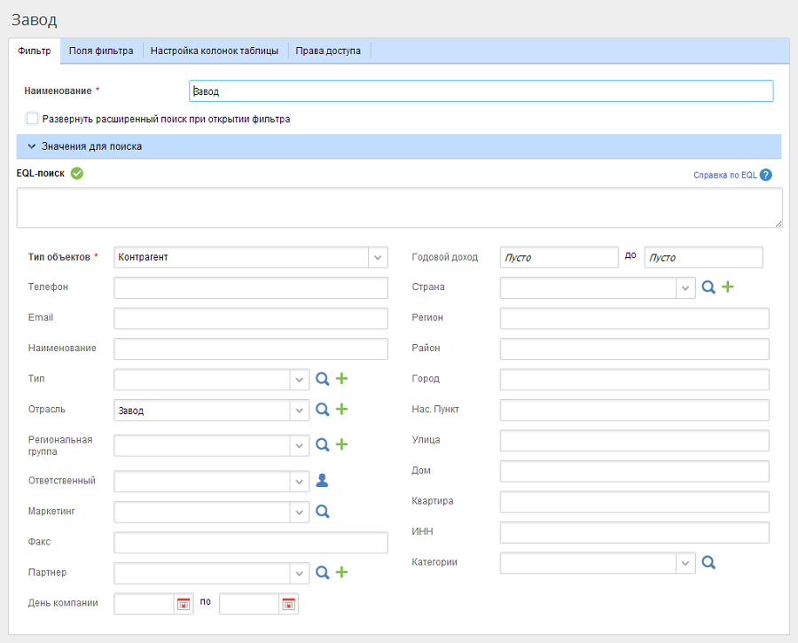 Значения для поиска – форма расширенного поиска, содержащая в себе параметры поиска с возможностью их редактирования. По нажатию на заголовок раздела, можно свернуть или развернуть его.