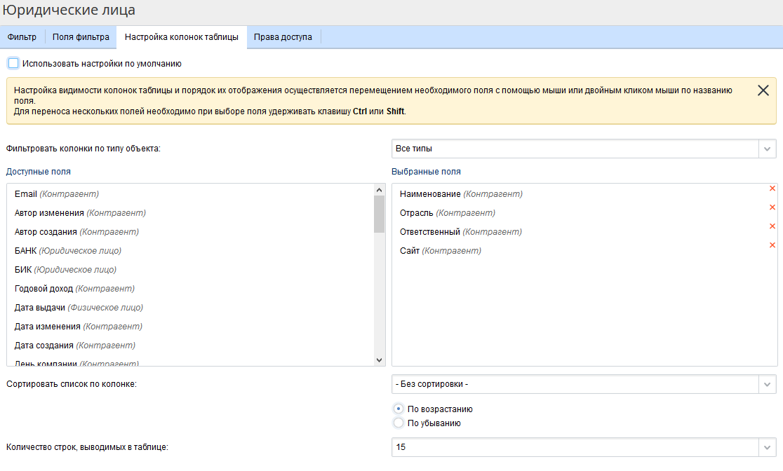 Использовать настройки по умолчанию – настройка по умолчанию колонок таблицы с результатами при открытии фильтра. Настройки по умолчанию можно установить при настройке таблицы отображения данных, в данном случае при настройке таблицы отображения данных о контрагентах (ссылка на картинку на страницу про создание фильтра). Если в разделе данных не установлены настройки по умолчанию для таблицы отображения данных, то таблица настраивается в соответствии с базовыми атрибутами соответствующих объектов в Дизайнере.