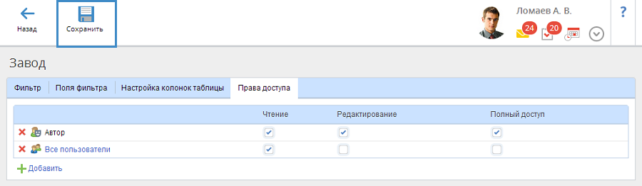 На вкладке Права доступа (рис. 7) существует возможность назначить права доступа к фильтру разным пользователям.