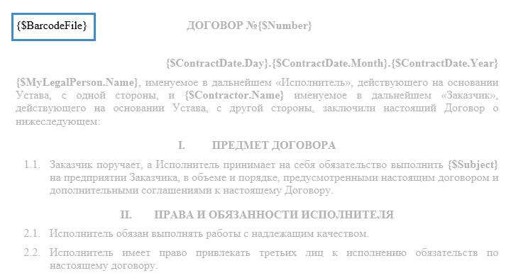 Для того, чтобы штрих-код был добавлен на страницу документа, необходимо в шаблон документа вставить переменную BarcodeFile, в которой хранится сформированный штрих-код (рис. 4).