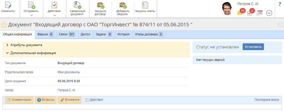 Карточка типа документа: Договор, Входящий договор, Исходящий договор аналогична карточке электронного документа, но имеет дополнительные вкладки и кнопки (рис. 1).