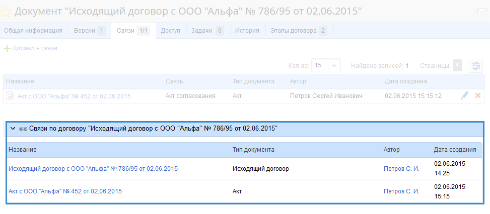 Рис. 2. Карточка договора. Вкладка "Связи"