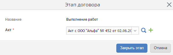 Акт – из выпадающего списка при необходимости выбрать акт, подтверждающий закрытие этапа договора. При указании акта этап договора автоматически закрывается. Данное поле не обязательно для заполнения. Для поиска необходимого документа воспользуйтесь кнопкой