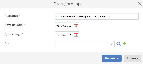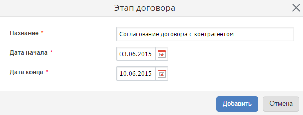 для сохранения этапа договора и добавления его к договору необходимо нажать на кнопку Добавить, для отмены создания этапа договора необходимо нажать на кнопку Отмена.