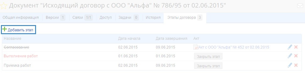Рис. 8. Карточка договора. Вкладка "Этапы договора". Кнопка "Закрыть этап"