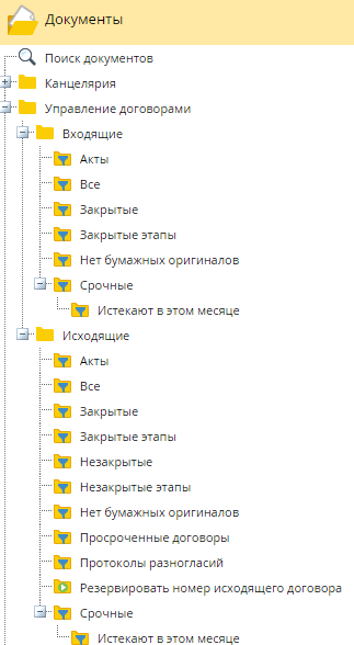 При активированном приложении Управление договорами в папке Документы отображается раздел Управление договорами. Данный раздел состоит из систематизированных папок-фильтров. Таким образом раздел Управление договорами представляет собой удобный инструмент для сортировки и быстрого поиска зарегистрированных документов типов: Входящий договор, Исходящий договор, Акт, Протокол разногласий. При изменении атрибутов документа он автоматически перемещается из одной папки-фильтра в другую (рис. 1).