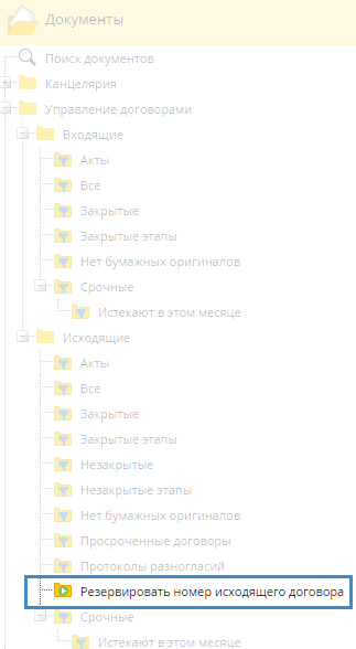 При активированном приложении Управление договорами предусмотрена возможность резервировать регистрационные номера для исходящих договоров. Для этого необходимо нажать на папку-действиеРезервировать номер исходящего договора в разделе Управление договорами папки Документы (рис. 2).