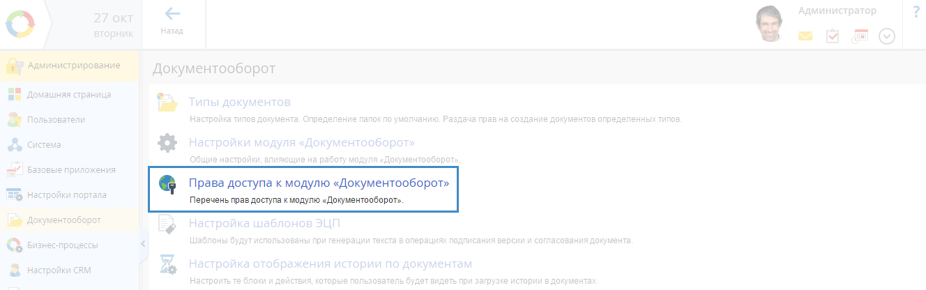 Рис. 1. Раздел "Администрирование – Документооборот – права доступа к модулю "Документооборот"