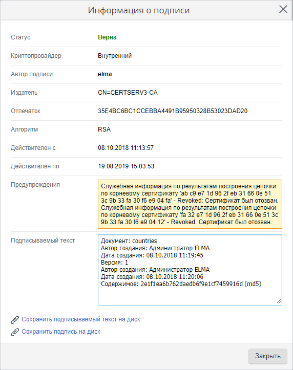 Подпись содержит полные данные сертификатов из списка отзыва сертификатов, использующихся для проверки подписи
