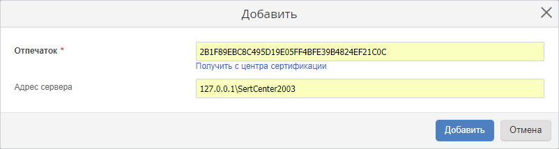 Для добавления отпечатка корневого сертификата необходимо нажать на кнопку